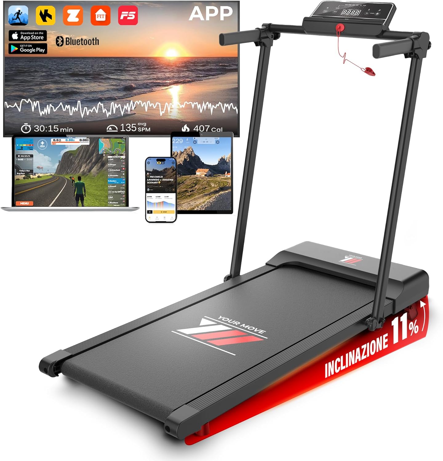 Scopri YM Tapis Roulant Salvaspazio Elettrico NEXT 1000 Your Move: allenati fino a 12 km/h con inclinazione e programmi completi, massima stabilità e comfort in un design pieghevole con assistenza italiana